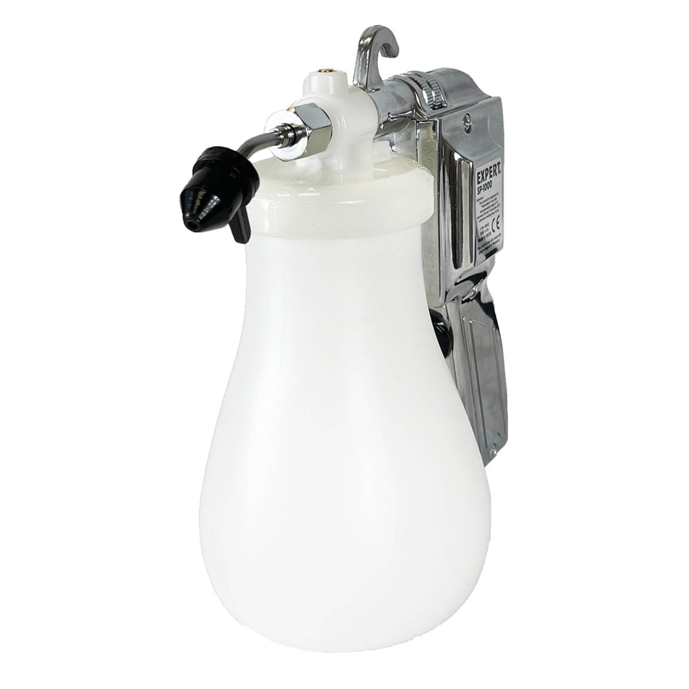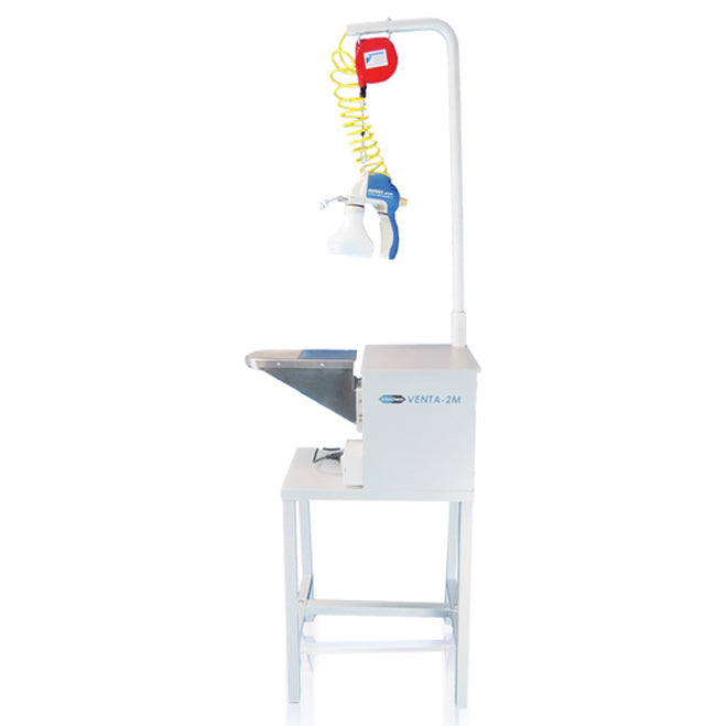 Complete spot cleaning station in 2 square feet of space. Sleeve shaped cleaning arm designed for cleaning all types of apparel. Sturdy steel housing and legs. Most powerful suction to speed drying and remove solvent fumes. Support Pole with Albatross Gun Reel (included) reduces operator fatigue.