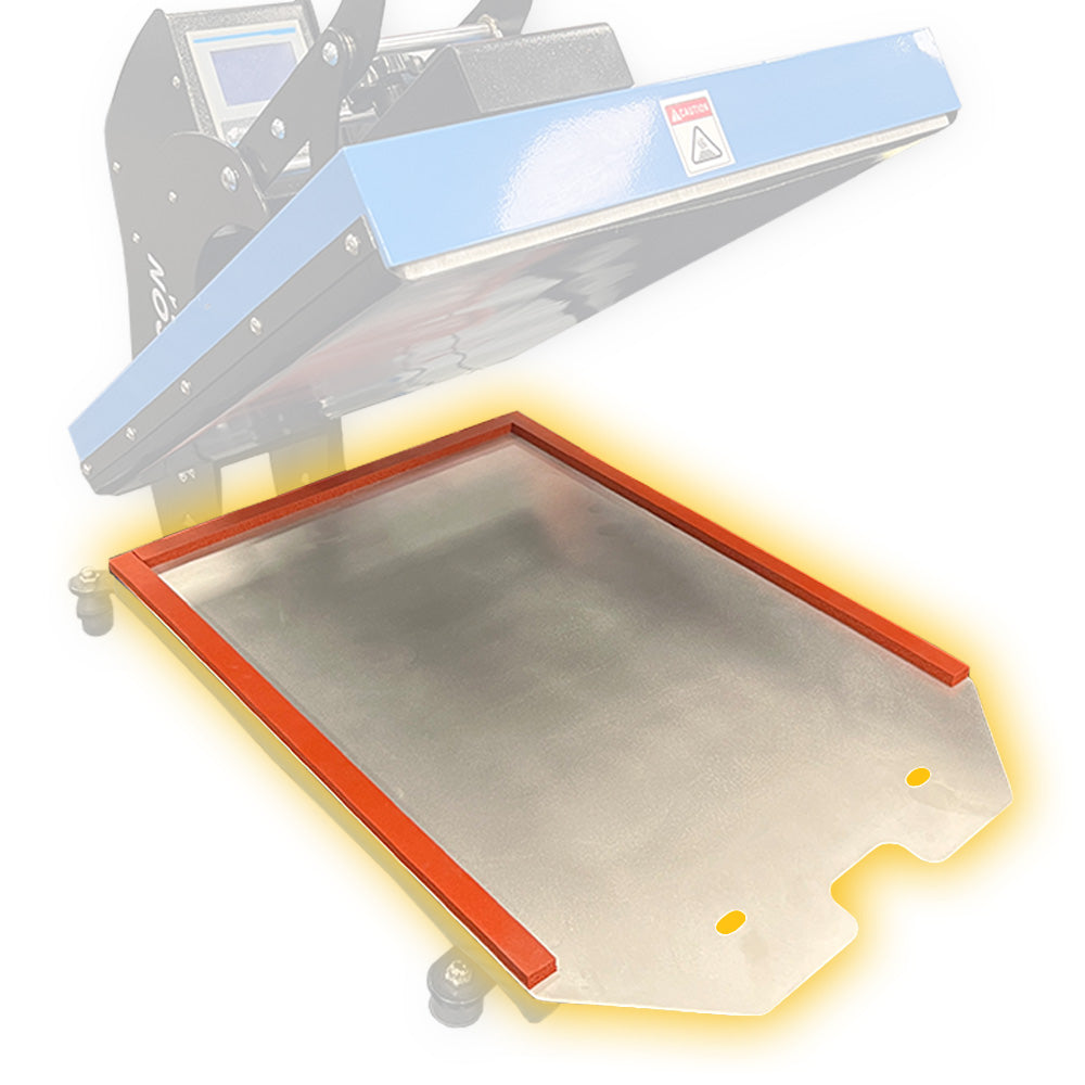 Set the DTF Cure-Tray onto the heat press platen. Align the tray with the back corners of the platen, (the front edge of the tray will extend beyond the front portion of the heat press platen).