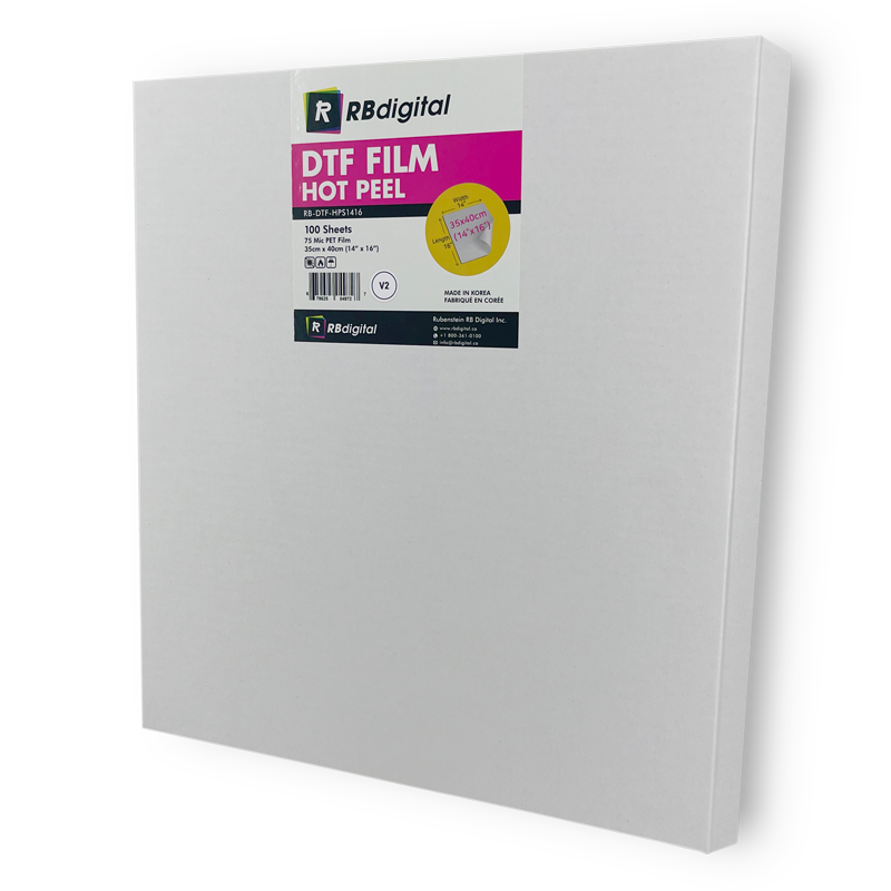 With our RB DTF Hot Peel Film, you can achieve either a glossy or matte finish for your print, depending on how you apply the film to the shirt. For a matte finish, cover your print with silicone-coated parchment paper before pressing with your heat press. For a glossy finish, use a Teflon sheet or a heat press with a Teflon-covered top when heat pressing the film.