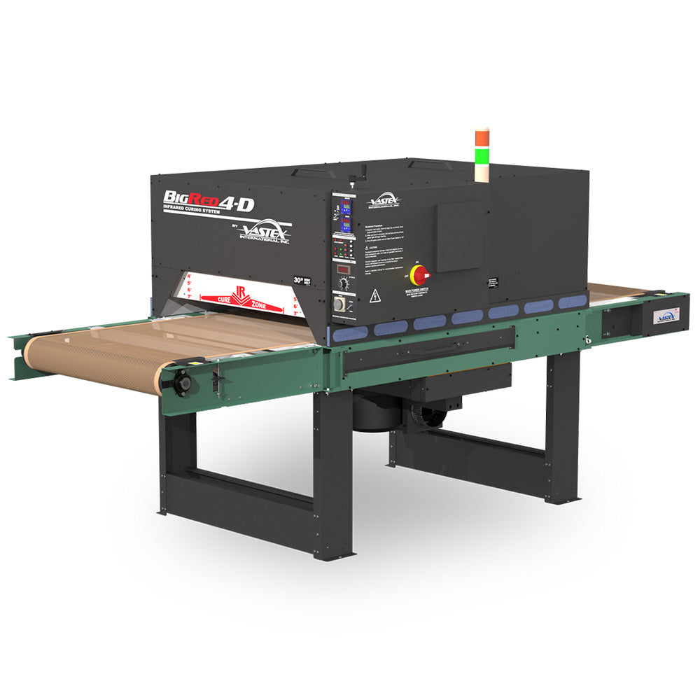 Model BR4D-V30 with a 30 in. (76 cm) wide belt and four 24 in. (61 cm) wide heaters (total 11,400 watts) cures 72 garments/h printed with DTG/digital white ink at 2.5 minutes dwell time, 216 garments/h with water-based ink or discharge, and 475 garments/h with plastisol ink or DTF adhesives.
