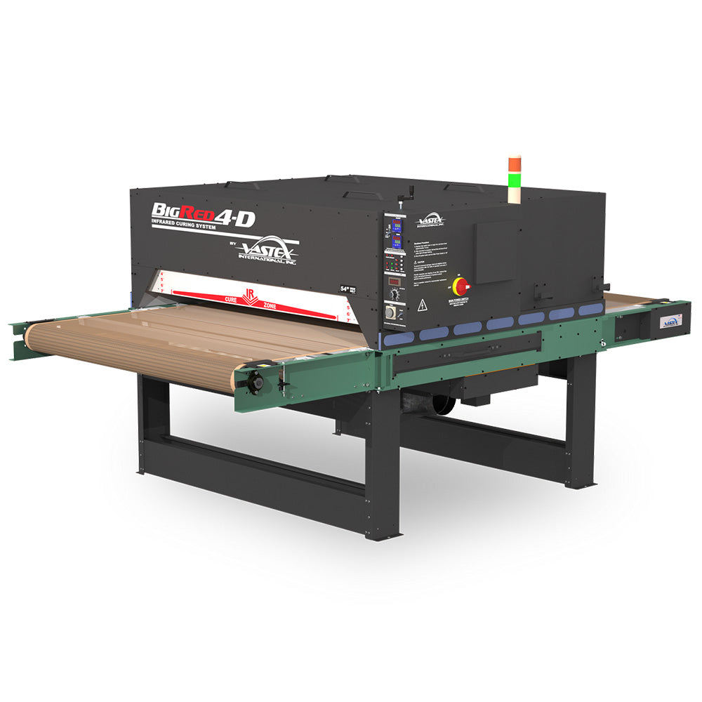 Model BR4D-V54 with a 54 in. (137 cm) wide belt and four 48 in. (122 cm) wide heaters (total 22,800 watts) cures 144 garments/h printed with DTG/digital white ink at 2.5 minutes dwell time, 432 garments/h with water-based ink or discharge, and 950 garments/h with plastisol ink.*