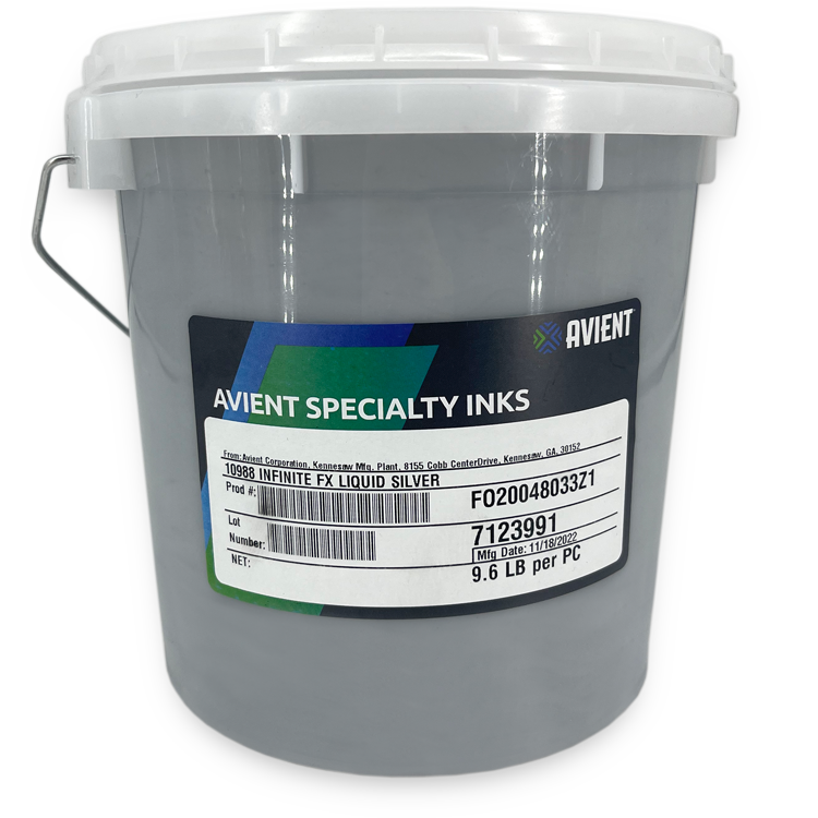 Wilflex™ Speciality Ink INFINITE FX LIQUIDS are a special effect with a very-fine metallic flake for an opaque, wet metallic chrome or gilded gold look with a smooth and soft feel. The Liquid Silver and Gold are ready-for-use or can be tinted using plastisol colorants for a custom look.