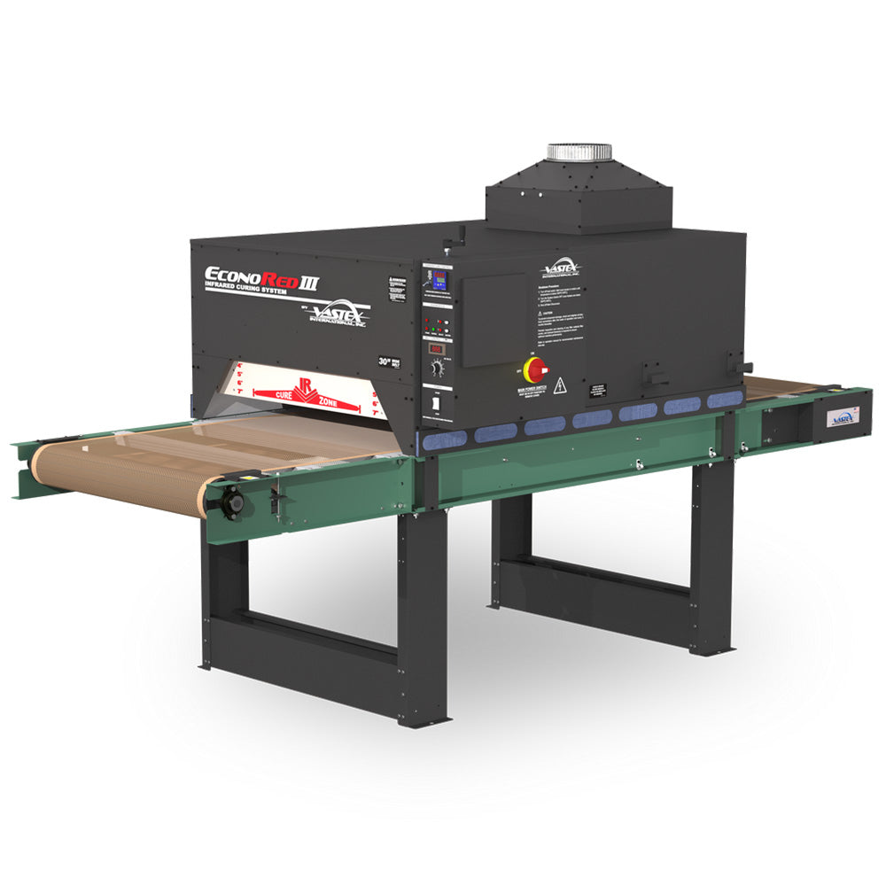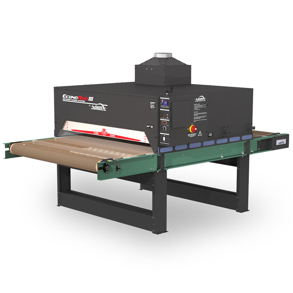 Model ER-III-54, with 54 in. (137 cm) wide belt and three 48 in. (122 cm) heaters (total 21,600 watts) cures up to 950 plastisol-printed garments/h, or 300 garments/h screen-printed with water-based ink or discharge.