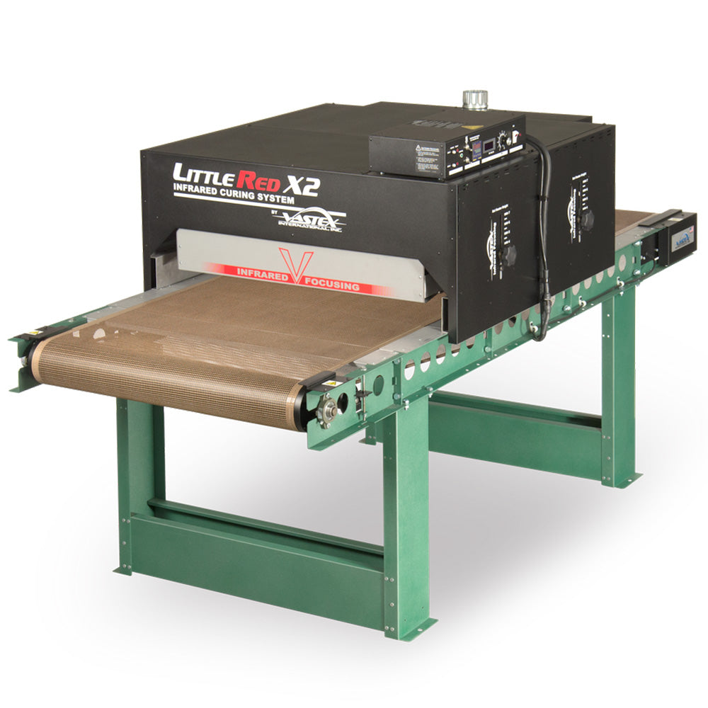The Little Red X2-30 model with 30 in. (76 cm) wide x 66 in. (167.6 cm) long conveyor belt is offered with two 24 in. (61 cm) wide 240V/2,600 watt heaters to cure up to 260 plastisol-printed images/h, 90 discharge or water-based printed images/h, and/or DTF adhesives at high rates.