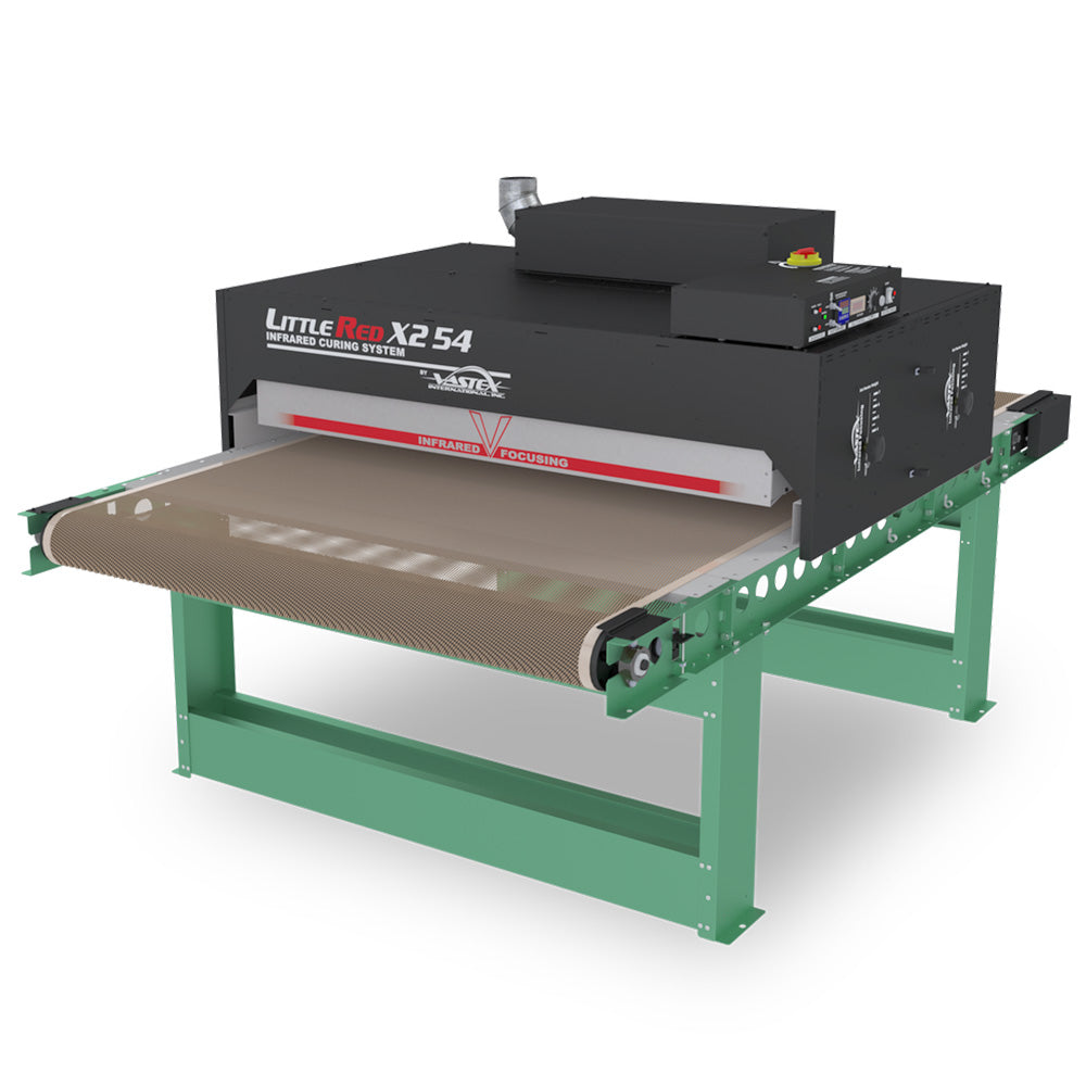 The Little Red X2-54 model with 54 in. (137 cm) wide x 66 in. (167.6 cm) long conveyor is equipped with two 48 in. (122 cm) wide 240V/5,200 watt infrared heaters that cure up to 520 plastisol-printed images/h, 180 discharge or water-based printed images/h, and/or DTF adhesives at high rates.