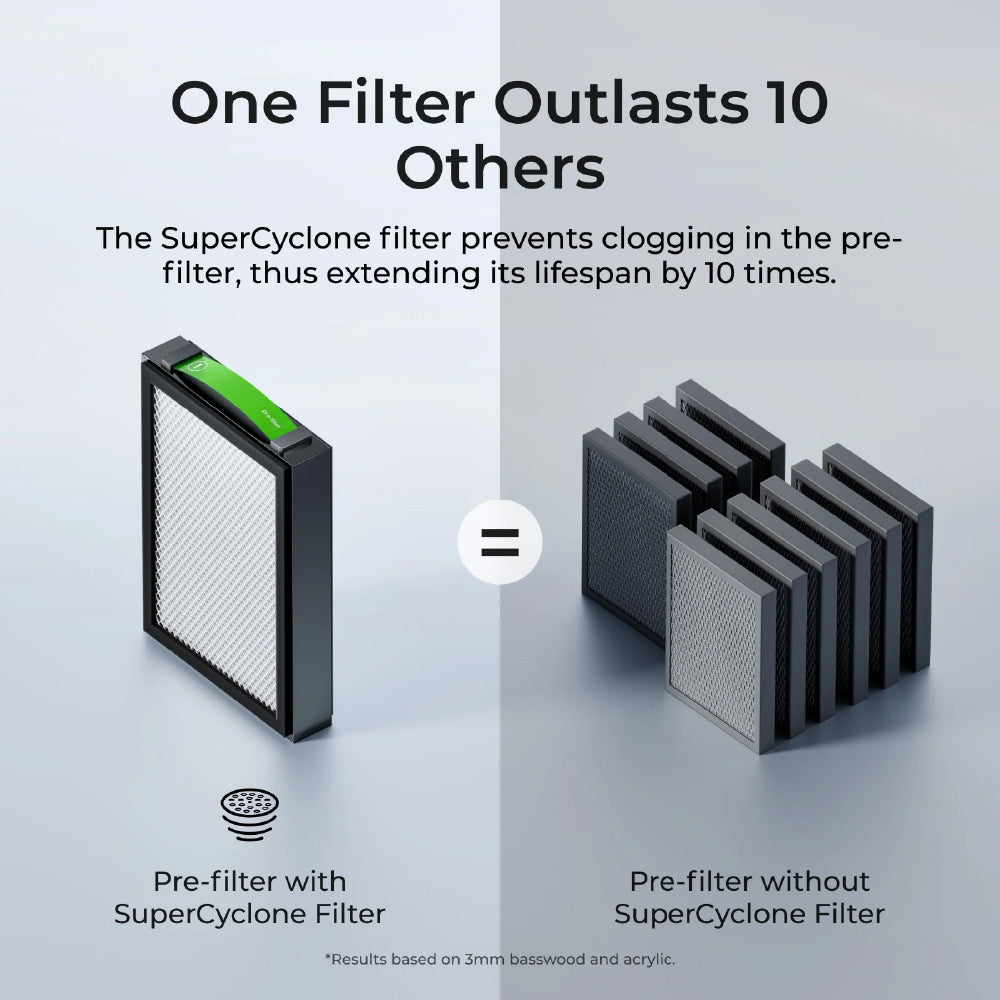 With a cyclone in place, all large particles can be separated, extending the lifespan of filters up to 10 times compared to those without a cyclone.*The results estimate the filtration of residue from the regular laser cutting of 3mm acrylic and basswood.