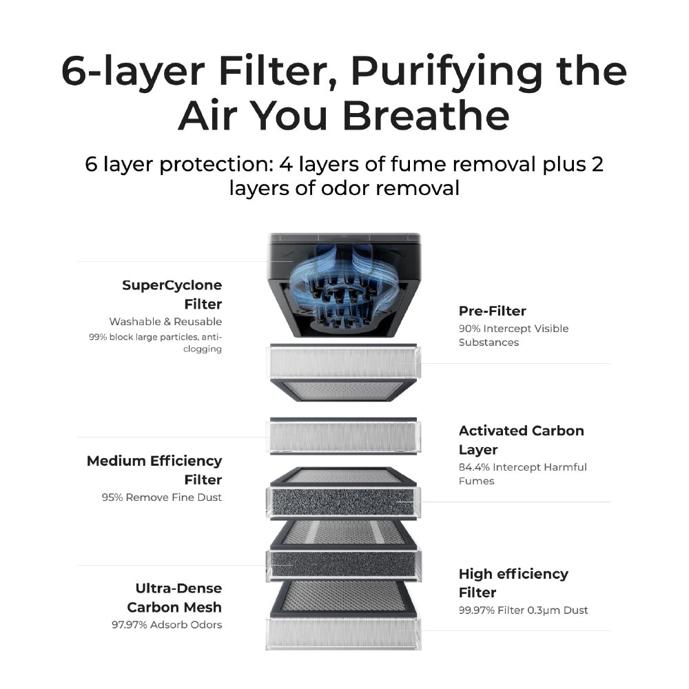 | Filter Layers | SuperCyclone Filter, Pre-Filter, Medium Efficiency Filter, Activated Carbon Layer, Ultra-Dense Carbon Mesh, High Efficiency Filter |