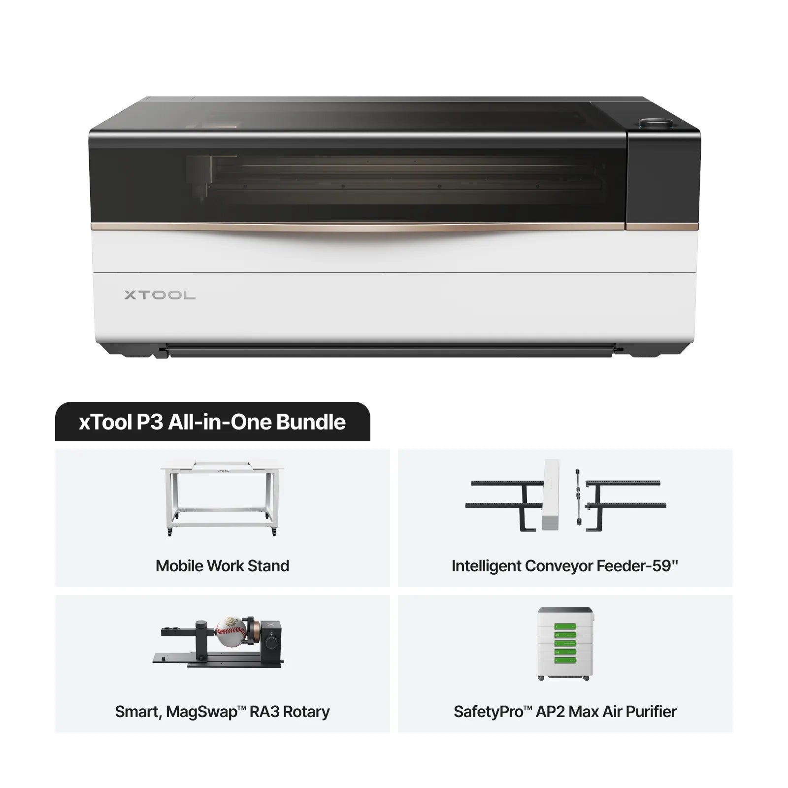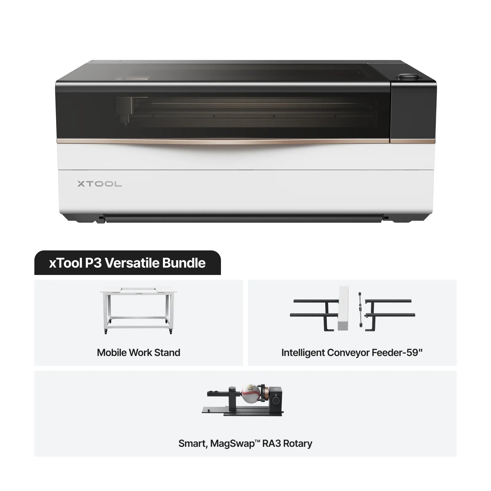 - Working Area: The standard working area of the xTool P3 is an expansive 36" x 18" (915 mm x 458 mm). This is approximately 2.3 times the area of the P2S, allowing you to easily handle large-scale projects or more efficient batch production. Furthermore, for projects that require processing of extra-long materials, the P3 is compatible with the optional Intelligent Conveyor Feeder, which unlocks the ability to work on materials of virtually any length.