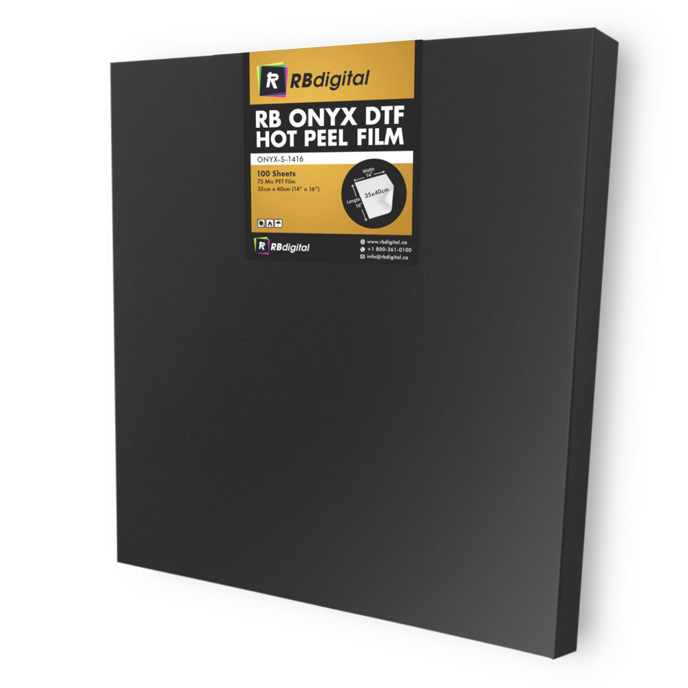 With RB Onyx DTF Hot Peel Film, you can achieve either a glossy or matte finish for your print, depending on how you apply the film to the shirt. For a matte finish, cover your print with silicone-coated parchment paper before pressing with your heat press. For a glossy finish, use a Teflon sheet or a heat press with a Teflon-covered top when heat pressing the film.