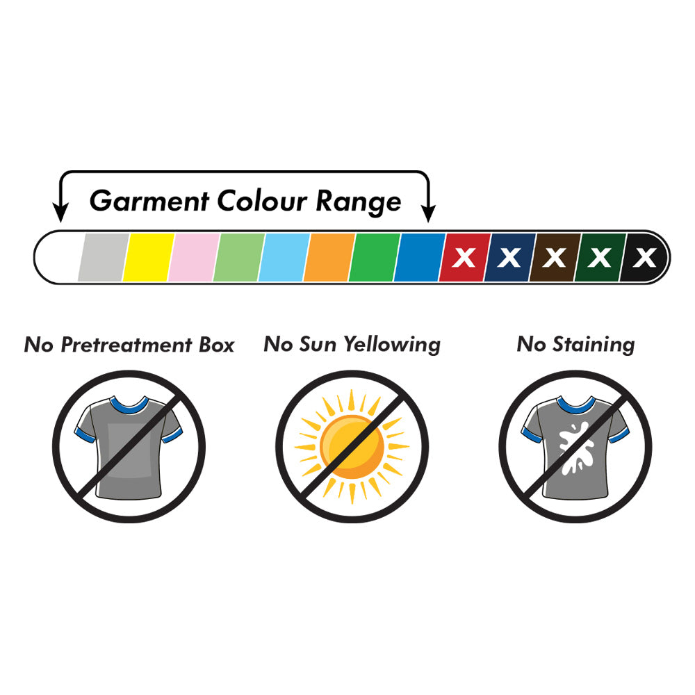 *If a conveyor oven is not available, air-dry for a minimum of 15 mins. Then heat-press at 300-350F, for 20-40 seconds, with 40-60PSI pressure (or until dry-to-touch). It is important to either conveyor-cure or air-dry to prevent from creating a glossy film visible on the sprayed area on the garment when only heat pressing.