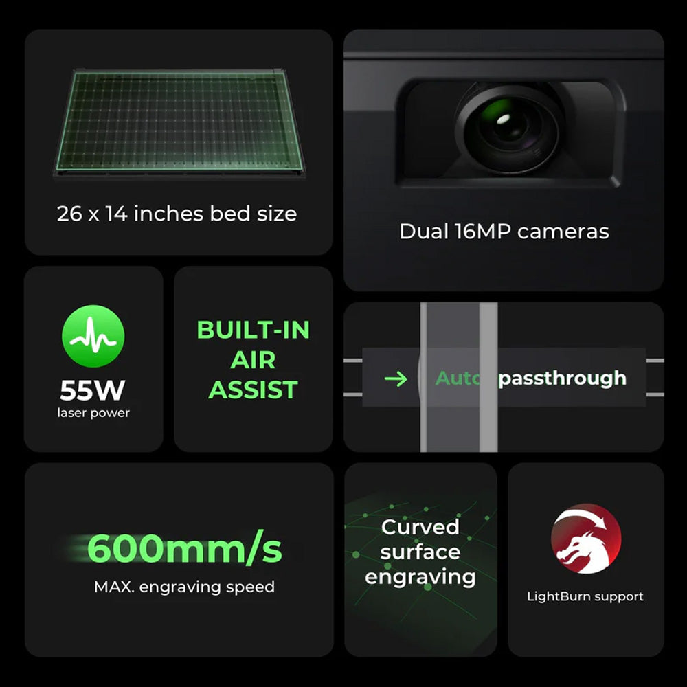 Get More Done in Less TimeP2 55W laser power easily cuts 18mm basswood and 20mm acrylic in one pass, F1 Ultra's true speed of 10,000 mm/s ensures efficient batch processing.