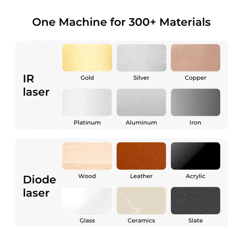10W Diode Laser Engrave • Wood • Leather • Cardboard • Glass • Rock • Cork • Opaque Acrylic • Rubber 2W Fiber Laser Engrave • Silver • Platinum • Aluminum • Titanium • Brass • Gold • Iron • Stainless Steel |
