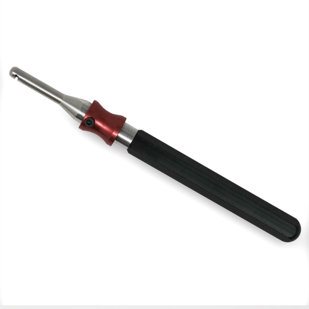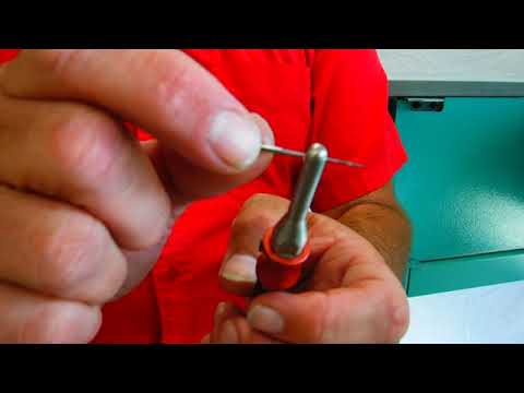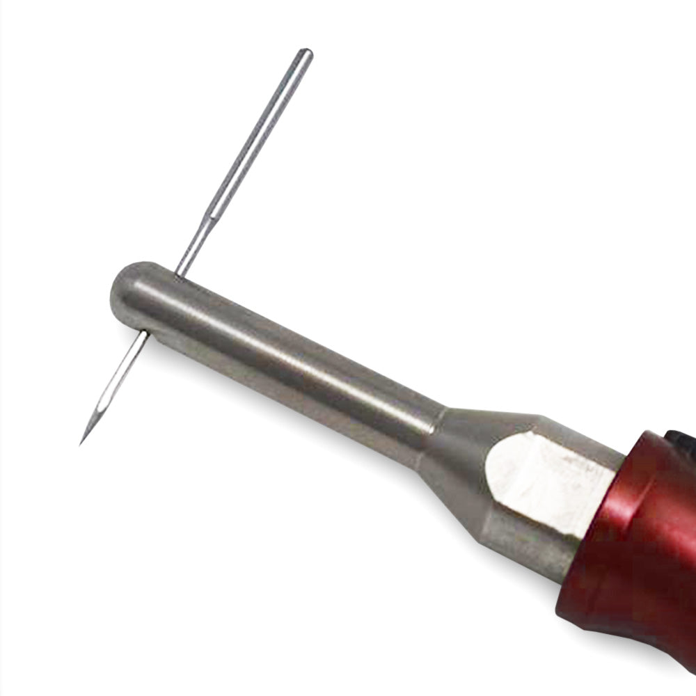 Hold the Needle Ease with the “NEEDLEASE.COM” logo and black set screw facing up. Pull back on the colored collar with one hand. With your other hand, slide your new needle down into the slot at the tip of the tool. Release the sleeve and slowly rotate the new needle until you hear or feel a “click.” Once you do, your new needle is now facing forward and you can install the needle into your machine.* To release the Needle Ease, pull back on the collar and slide it off of the needle.