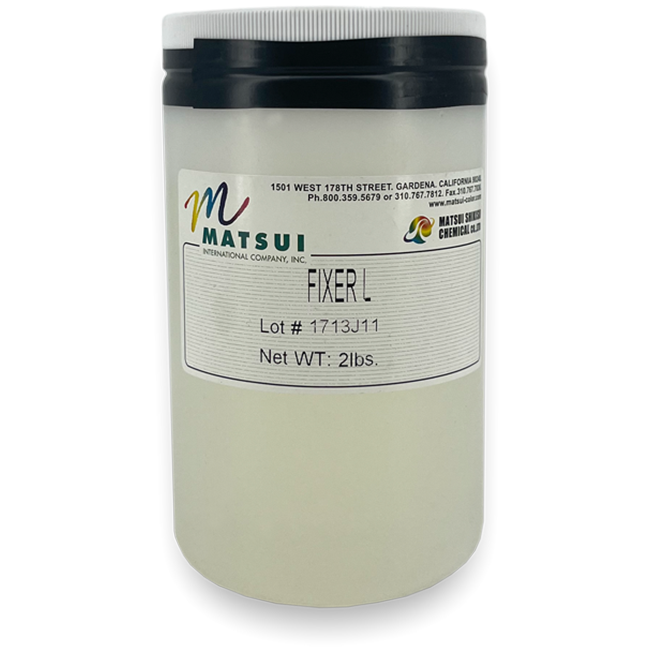 Use Matsui Fixer L at 2-3% is an air dry additive and helps improve wash fastness. Fixer L can help when lower cure temperatures or faster belt speeds are needed. The pot life of the ink is roughly 24 hours once mixed. This fixer meets ALL RSL (Restricted Substance List) of all major brands.