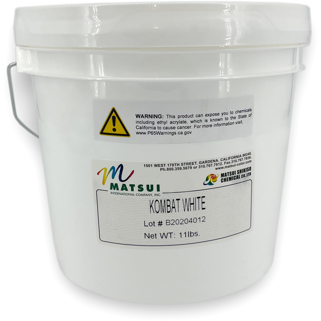 Print through fine screen mesh up to 160 mc in (63 mc cm) when cured at 320°F (160°C), Kombat White produces the softest prints achievable in textile screen printing today.