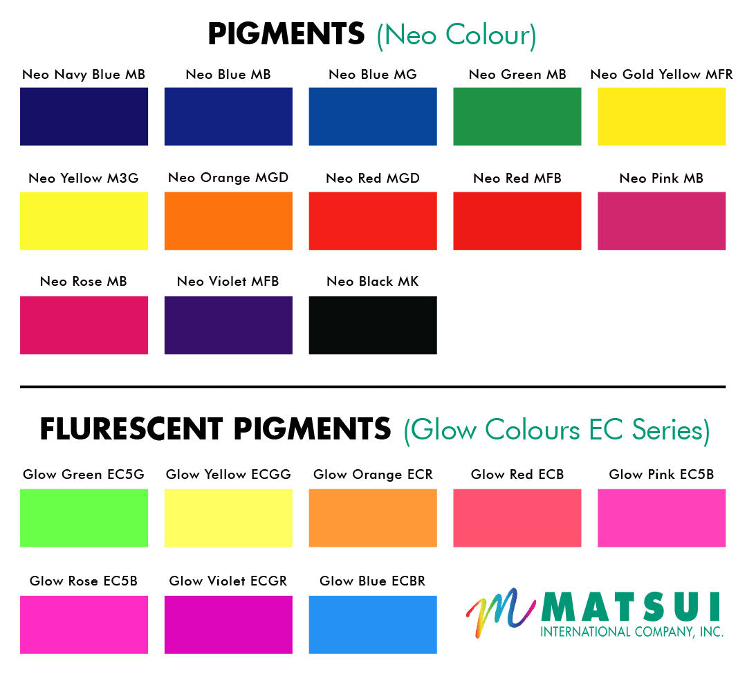 Neo Pigments are 13 concentrated Eco-friendly pigments that are base dependent and can be blended up to 15% in Matsui bases to create Pantone® colors.